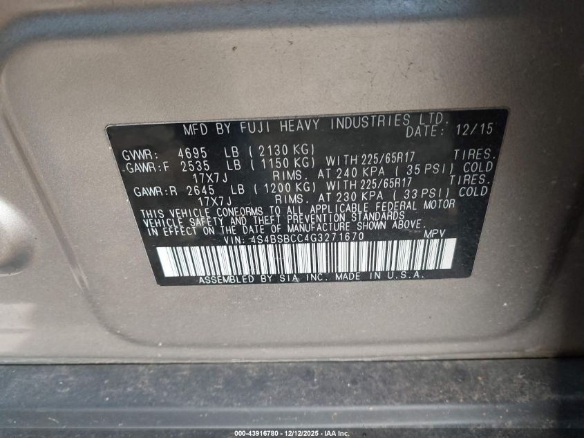 2016 SUBARU OUTBACK 2.5I LIMITED