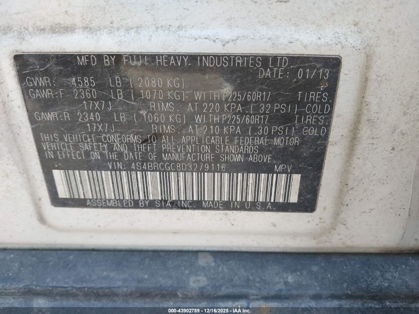 Цвет Цилиндры 4Привод Полный приводVIN 4S4BRCGC8D3279116Состояние НеизвестноПовреждения Передняя правая