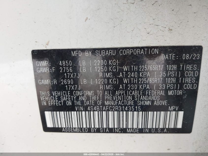 2024 SUBARU OUTBACK - 4S4BTAFC2R3143515, цвет - Белый, 2.5, Бензин, Полный привод из США