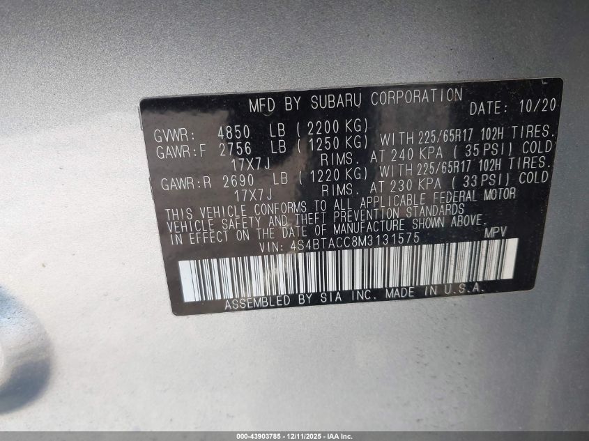 2021 SUBARU OUTBACK - 4S4BTACC8M3131575, цвет - Черный, 2.5, Бензин, Полный привод из США