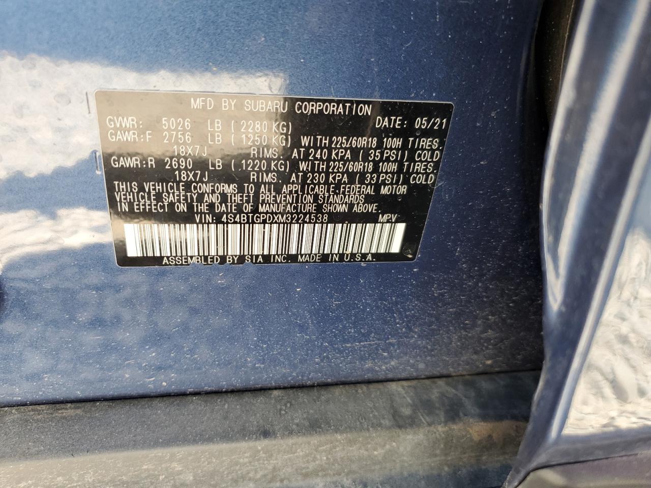 2021 SUBARU OUTBACK - 4S4BTGPDXM3224538, цвет - Синий, 2.4, Бензин, Полный привод из США