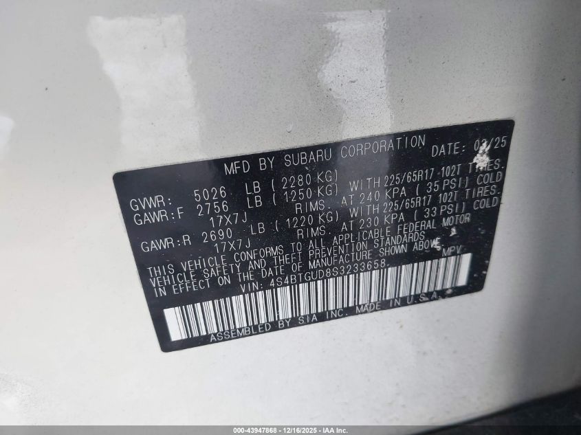 2025 SUBARU OUTBACK - 4S4BTGUD8S3233658, цвет - , 2.4, Бензин, Полный привод из США