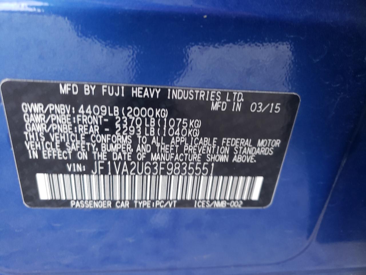 2015 SUBARU WRX - JF1VA2U63F9835551, цвет - Синий, 2.5, Бензин, Полный привод из США