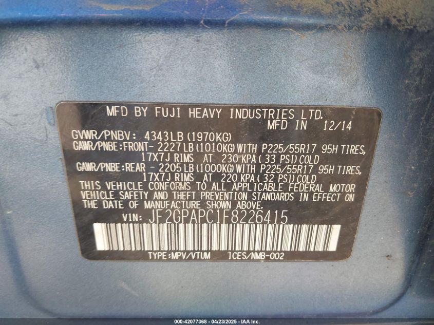 2015 SUBARU XV - JF2GPAPC1F8226415, цвет - Синий, 2.0, Бензин, Полный привод из США