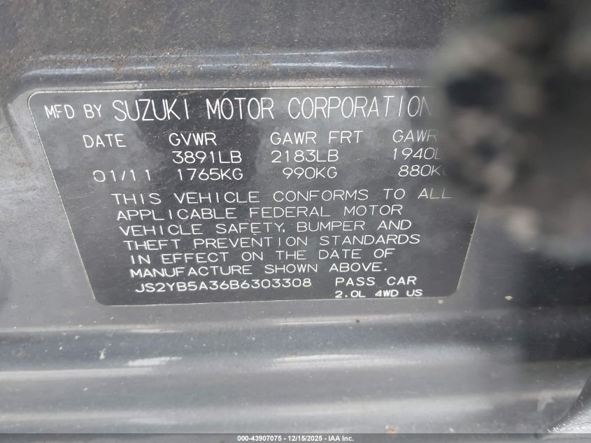 2011 SUZUKI SX4 - JS2YB5A36B6303308, цвет - , 2.0, Бензин, Полный привод из США