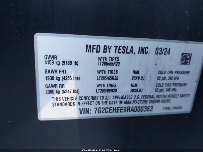2024 TESLA CYBERTRUCK - 7G2CEHEE9RA000363, цвет - Синий, U, Электрический, Полный привод из США
