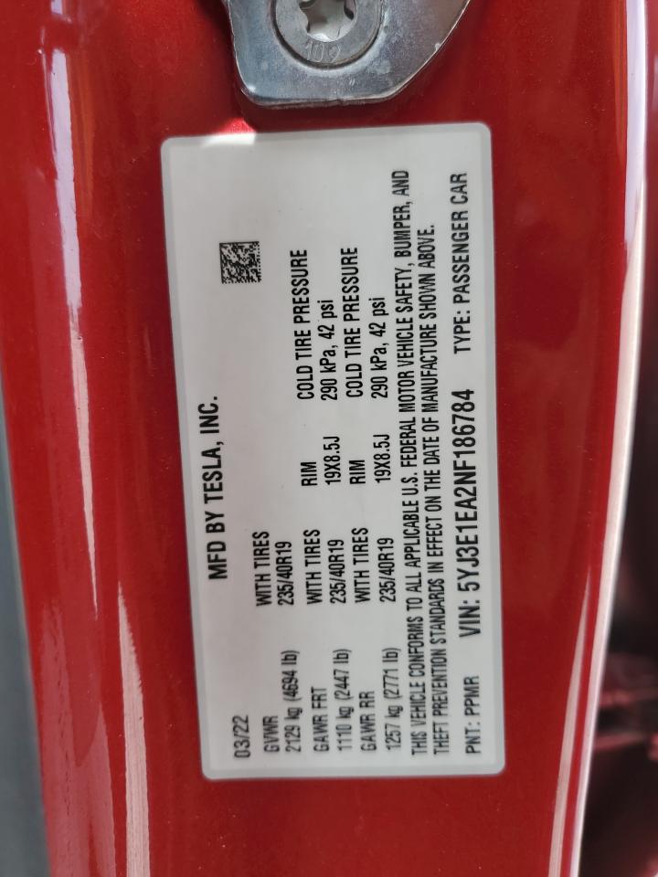 2022 TESLA MODEL 3 - 5YJ3E1EA2NF186784, цвет - Красный, , Электрический, Задний привод из США