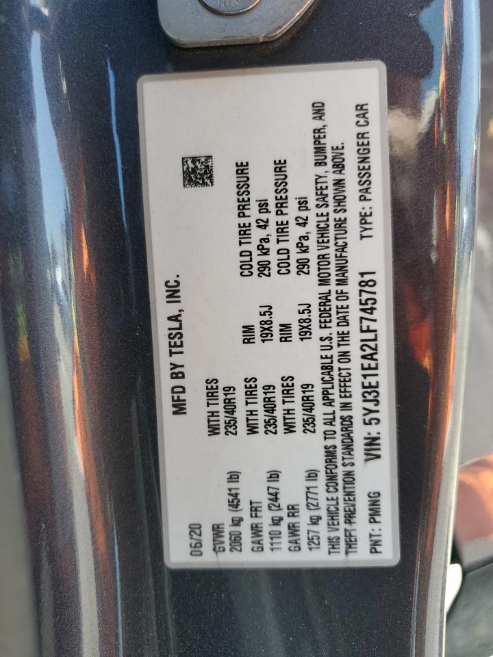 2020 TESLA MODEL 3 - 5YJ3E1EA2LF745781, цвет - Серый, , Электрический, Задний привод из США