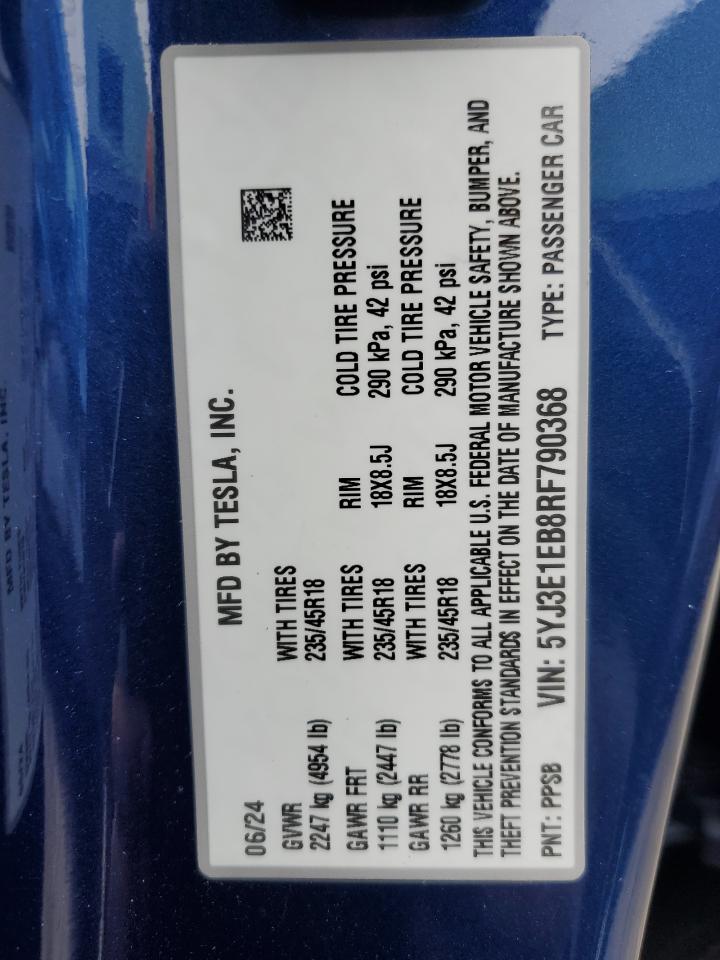 2024 TESLA MODEL 3 - 5YJ3E1EB8RF790368, цвет - Синий, , Электрический, Полный привод из США