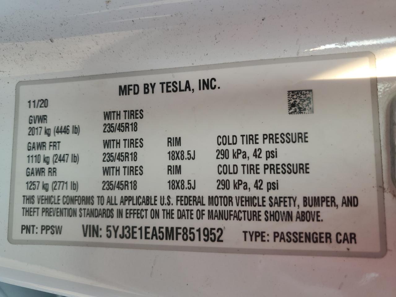 2021 TESLA MODEL 3 - 5YJ3E1EA5MF851952, цвет - Белый, , Электрический, Задний привод из США