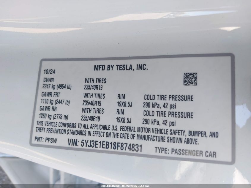 2025 TESLA MODEL 3 - 5YJ3E1EB1SF874831, цвет - Белый, U, Электрический, Полный привод из США