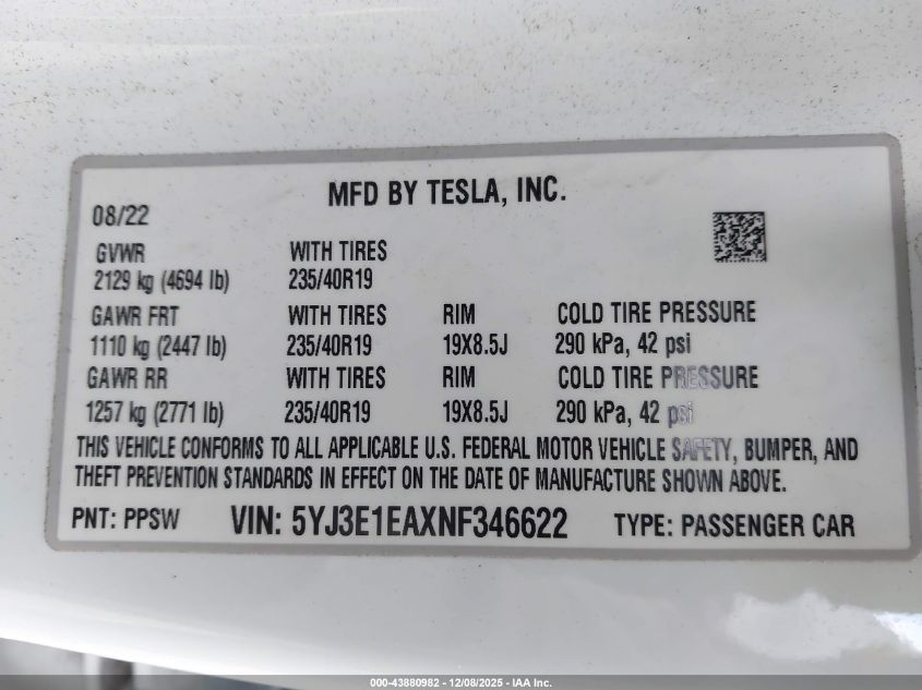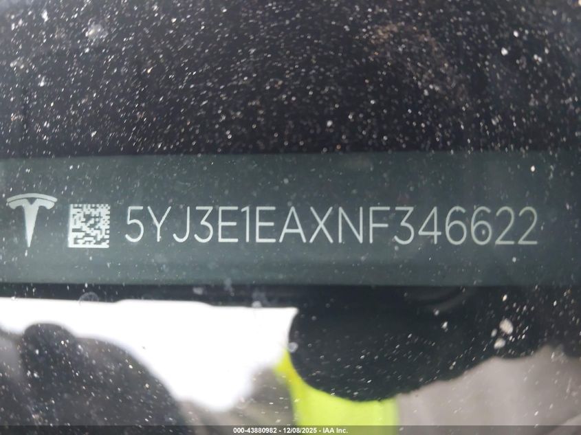 2022 TESLA MODEL 3 - 5YJ3E1EAXNF346622, цвет - Белый, U, Электрический, Задний привод из США