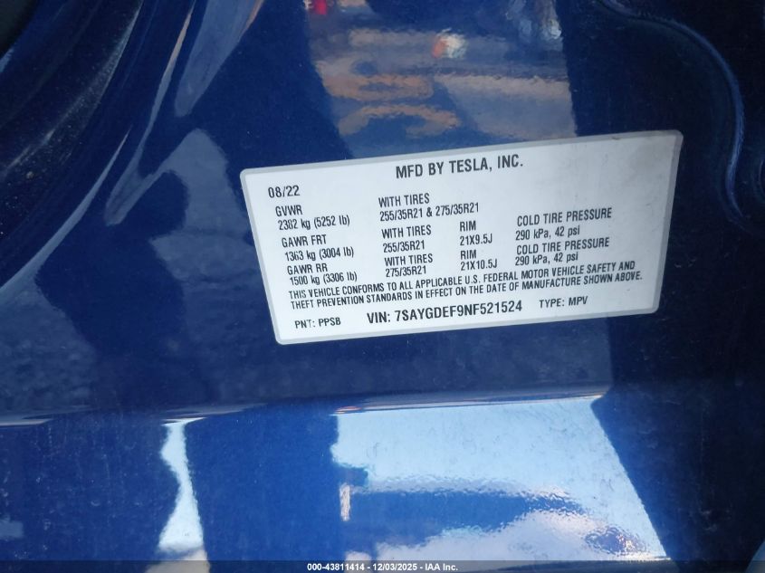 2022 TESLA MODEL Y - 7SAYGDEF9NF521524, цвет - Синий, U, Электрический, Полный привод из США