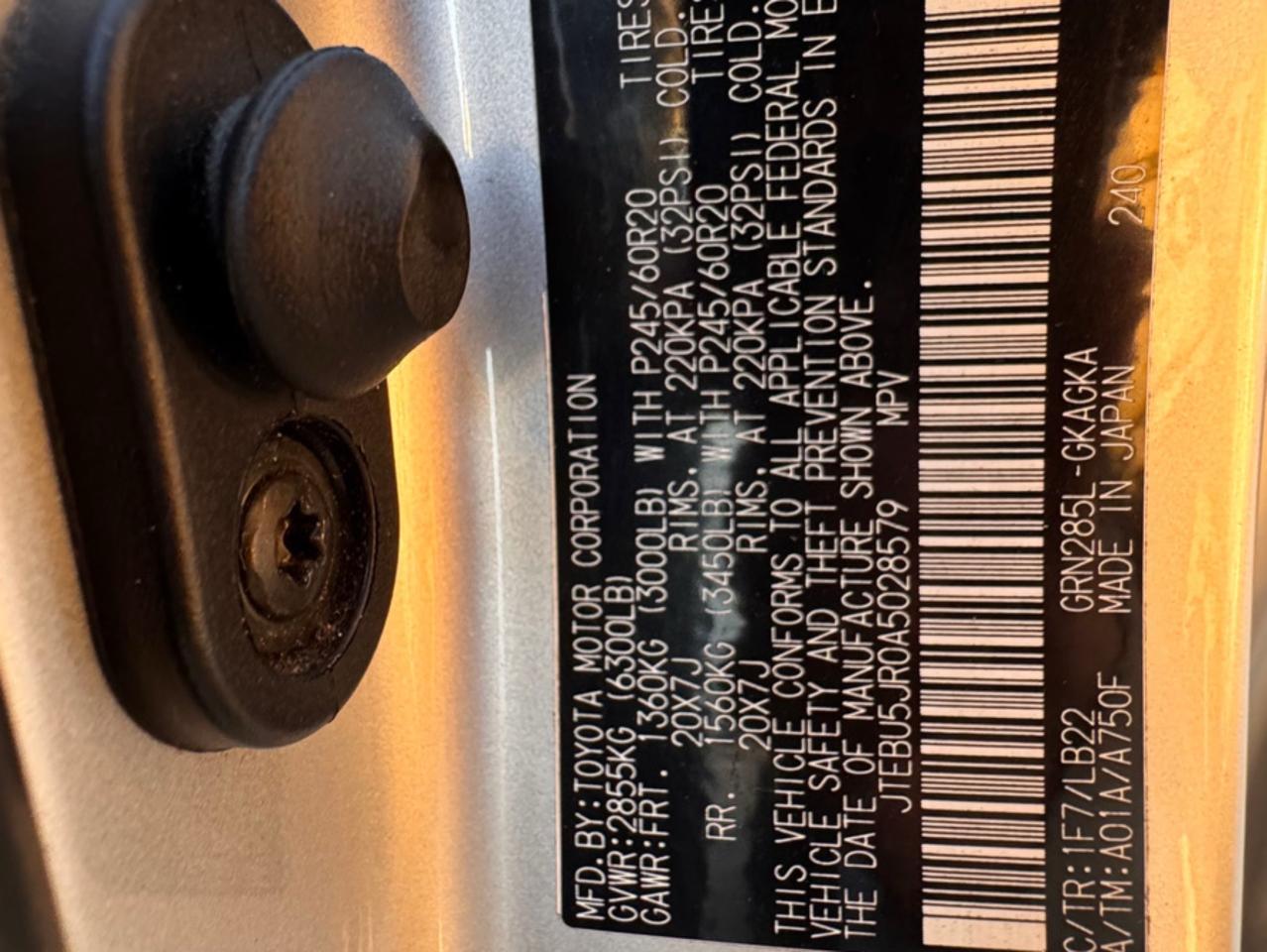 Цвет СеребряныйЦилиндры 6Привод Полный приводVIN JTEBU5JR0A5028579Состояние Заводится и едет (проверено)Повреждения НезначительныеДата аукциона 2025-10-07