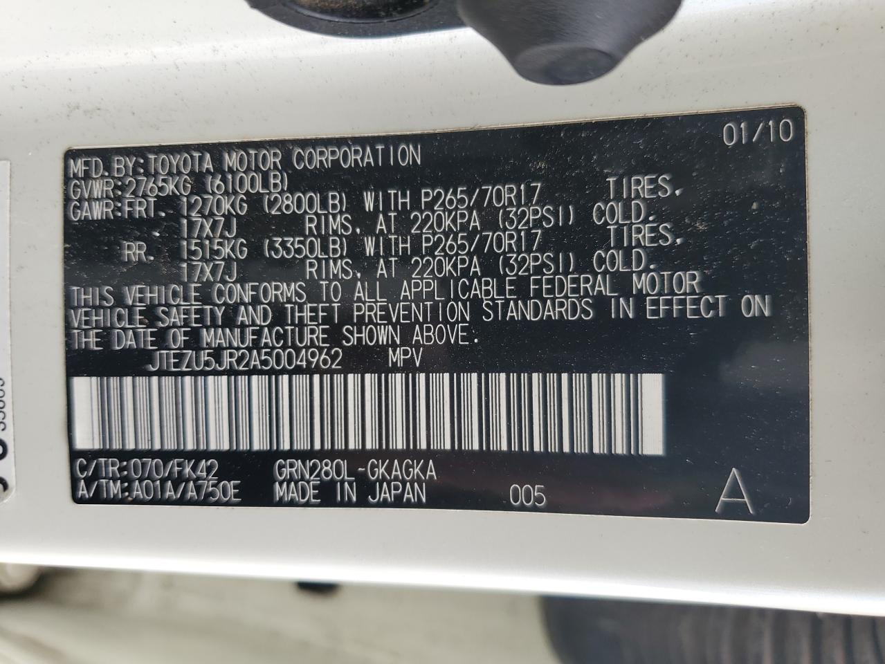 2010 TOYOTA 4RUNNER - JTEZU5JR2A5004962, цвет - Белый, 4.0, Бензин, Задний привод из США