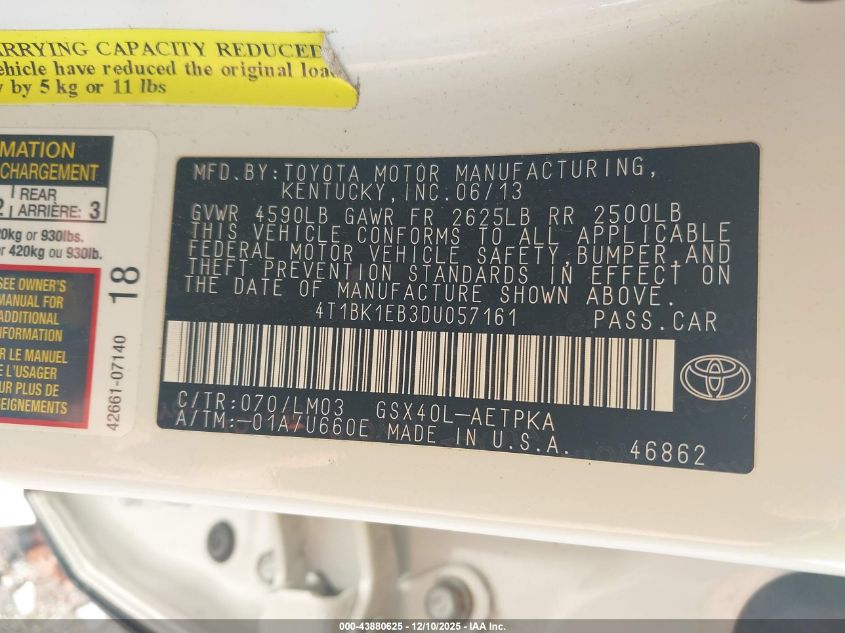 2013 TOYOTA AVALON - 4T1BK1EB3DU057161, цвет - Белый, 3.5, Бензин, Передний привод из США