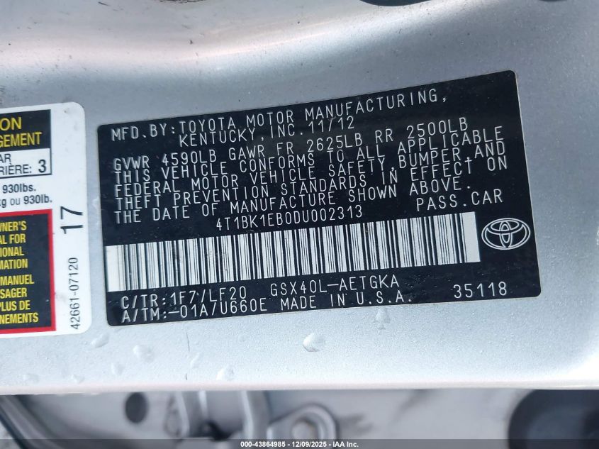2013 TOYOTA AVALON - 4T1BK1EB0DU002313, цвет - Серебряный, 3.5, Бензин, Передний привод из США