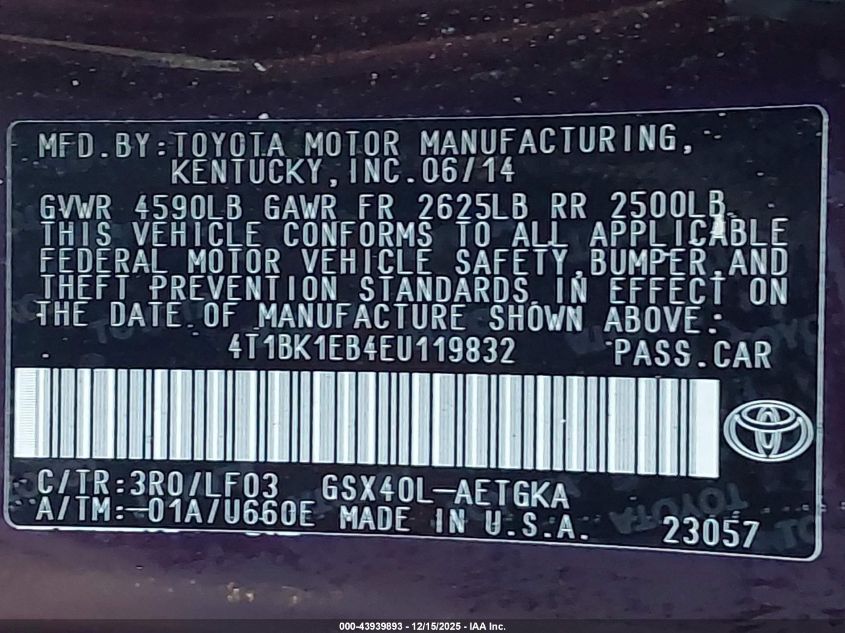Цвет БордовыйЦилиндры 6Привод Передний приводVIN 4T1BK1EB4EU119832Состояние Заводится и едет (проверено)Повреждения Передняя или задняя
