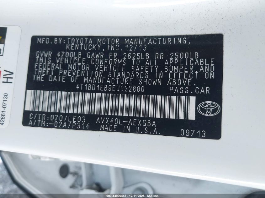 2014 TOYOTA AVALON - 4T1BD1EB9EU022880, цвет - Белый, 2.5, Гибрид, Передний привод из США