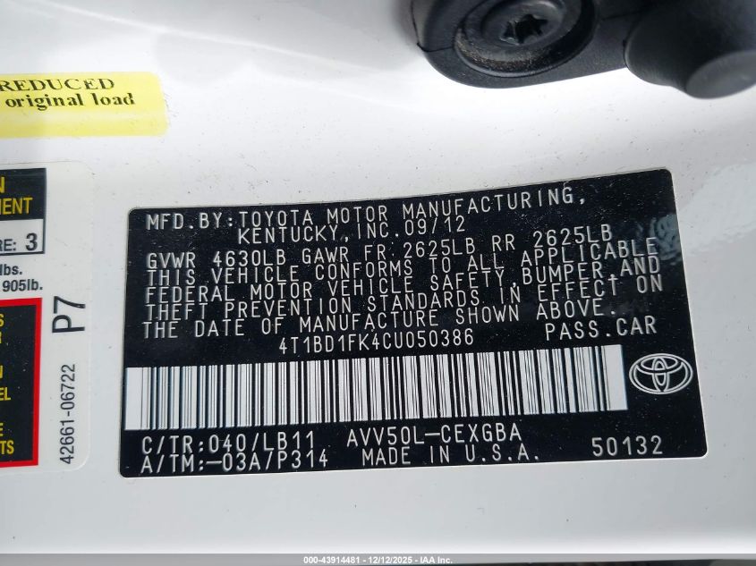 2012 TOYOTA CAMRY HYBRID - 4T1BD1FK4CU050386, цвет - Белый, 2.5, Гибрид, Передний привод из США