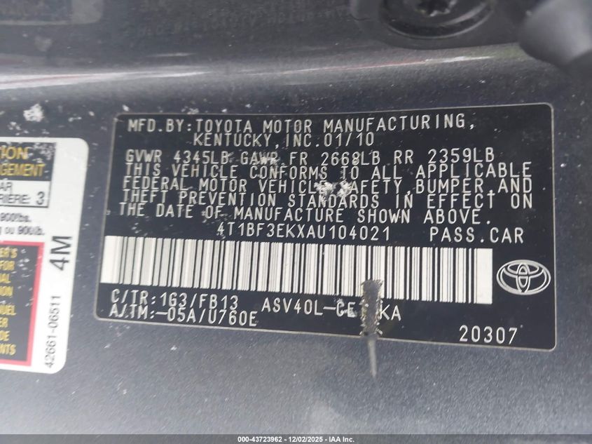 2010 TOYOTA CAMRY - 4T1BF3EKXAU104021, цвет - Серый, 2.5, Бензин, Передний привод из США