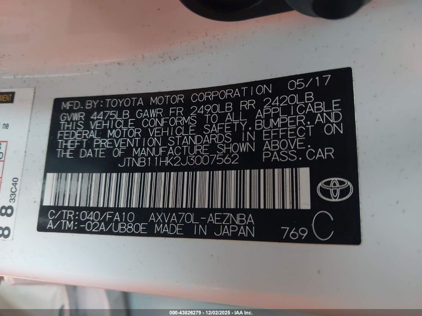 Цвет БелыйЦилиндры 4Привод Передний приводVIN JTNB11HK2J3007562Состояние СтационарноПовреждения Задняя