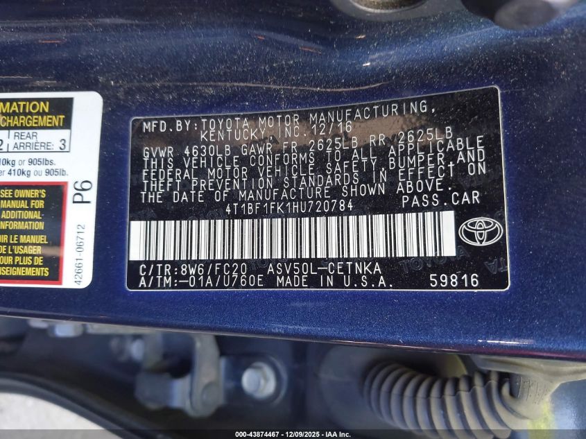 2017 TOYOTA CAMRY - 4T1BF1FK1HU720784, цвет - Синий, 2.5, Бензин, Передний привод из США