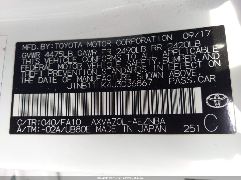 Цвет БелыйЦилиндры 4Привод Передний приводVIN JTNB11HK4J3036867Состояние Заводится и едет (проверено)Повреждения Правая сторона