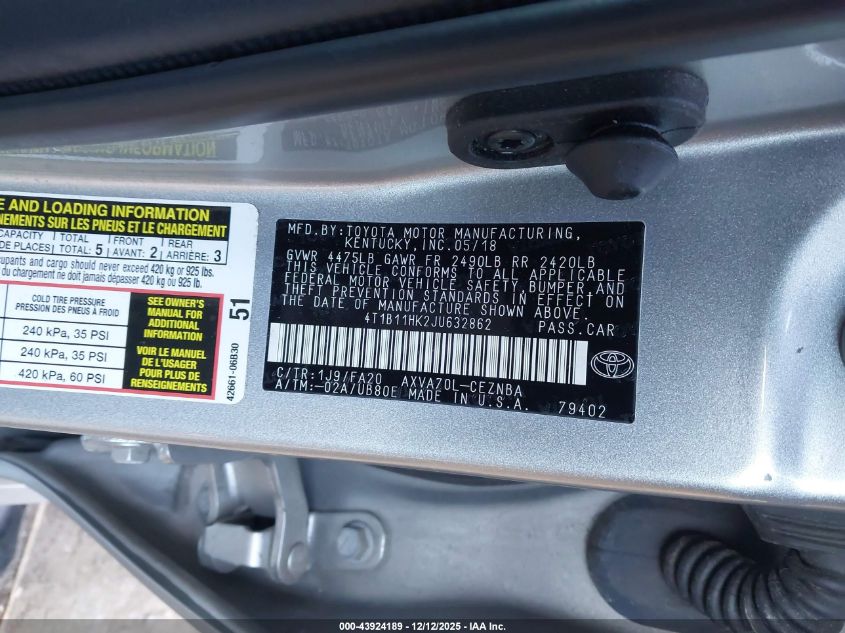 2018 TOYOTA CAMRY - 4T1B11HK2JU632862, цвет - Серебряный, 2.5, Бензин, Передний привод из США