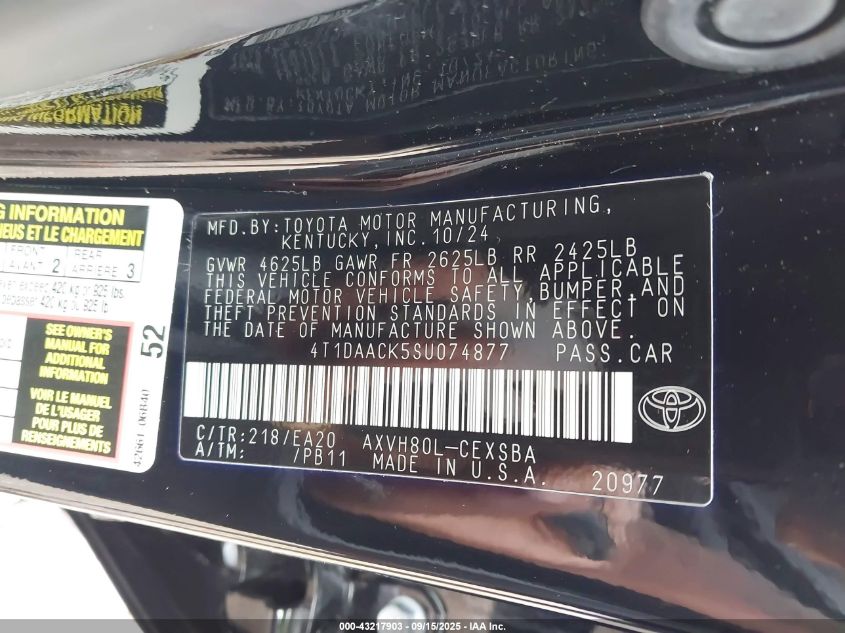 2025 TOYOTA CAMRY - 4T1DAACK5SU074877, цвет - Черный, 2.5, Гибрид, Передний привод из США