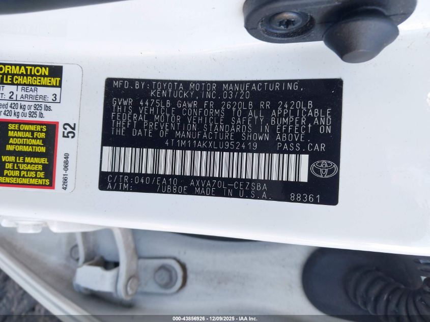 2020 TOYOTA CAMRY - 4T1M11AKXLU952419, цвет - Белый, 2.5, Бензин, Передний привод из США