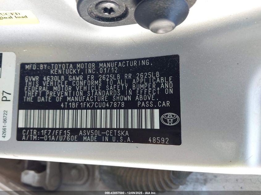 2012 TOYOTA CAMRY - 4T1BF1FK7CU047878, цвет - Серебряный, 2.5, Бензин, Передний привод из США
