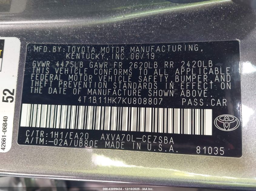 2019 TOYOTA CAMRY - 4T1B11HK7KU808807, цвет - Коричневий, 2.5, Бензин, Передний привод из США