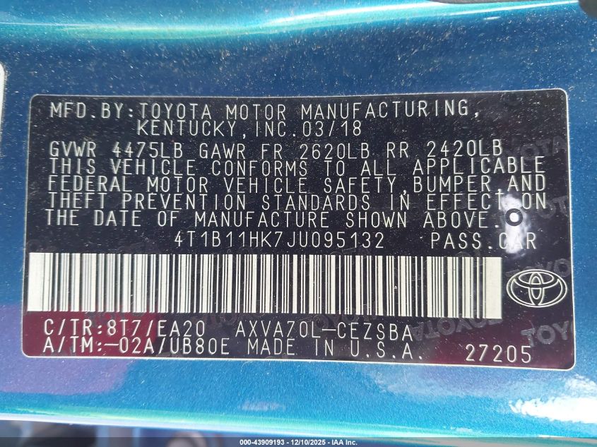 2018 TOYOTA CAMRY - 4T1B11HK7JU095132, цвет - Синий, 2.5, Бензин, Передний привод из США