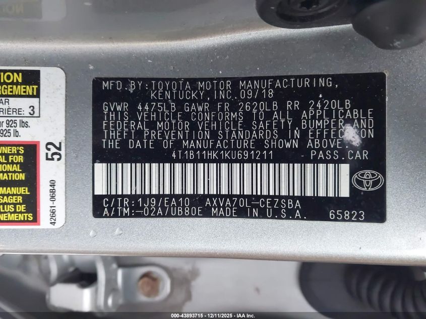 2019 TOYOTA CAMRY - 4T1B11HK1KU691211, цвет - Серебряный, 2.5, Бензин, Передний привод из США