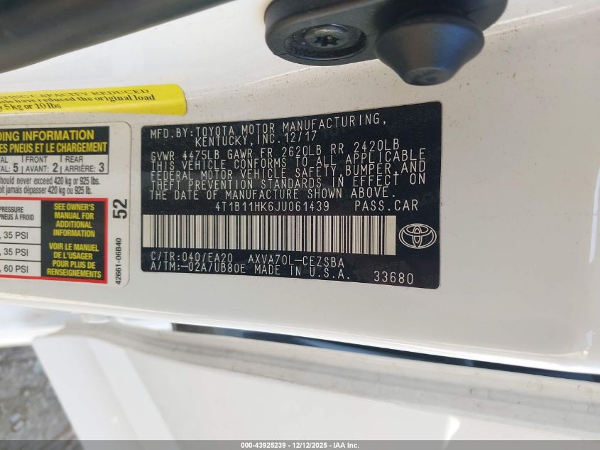 2018 TOYOTA CAMRY - 4T1B11HK6JU061439, цвет - Белый, 2.5, Бензин, Передний привод из США