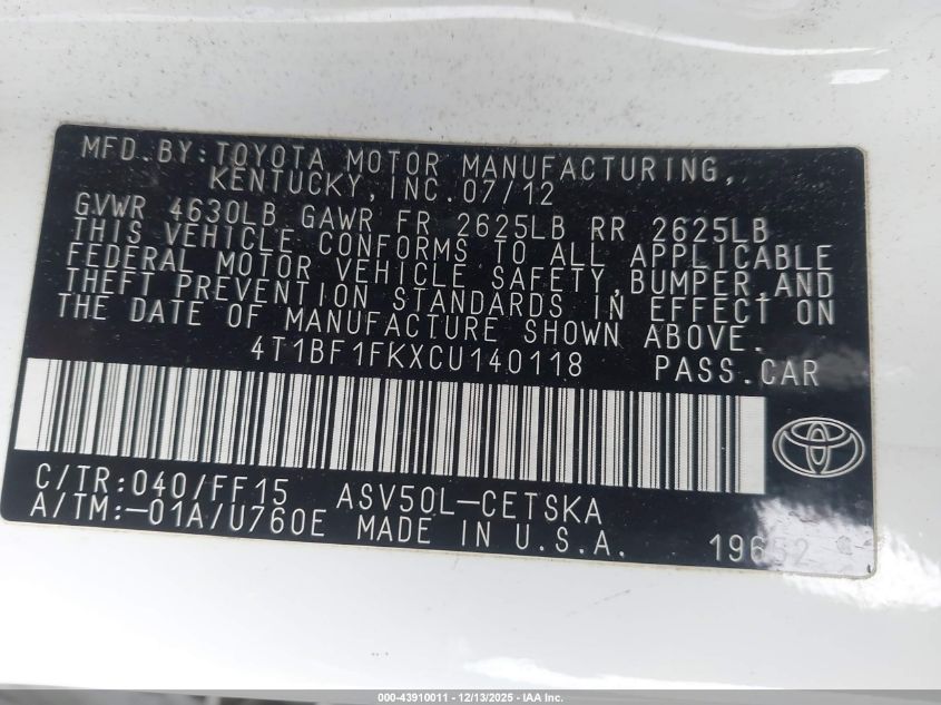 2012 TOYOTA CAMRY - 4T1BF1FKXCU140118, цвет - Белый, 2.5, Бензин, Передний привод из США