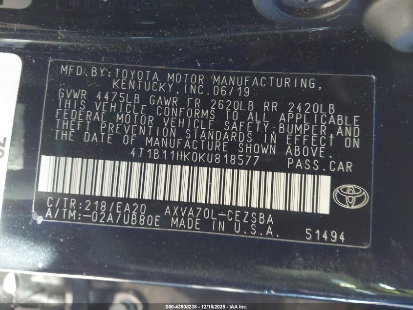 2019 TOYOTA CAMRY - 4T1B11HK0KU818577, цвет - Черный, 2.5, Бензин, Передний привод из США