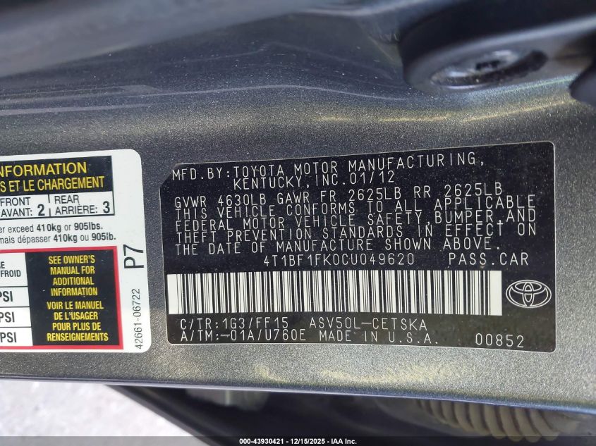 Цвет СерыйЦилиндры 4Привод Передний приводVIN 4T1BF1FK0CU049620Состояние ЗаводитсяПовреждения Передняя или задняя
