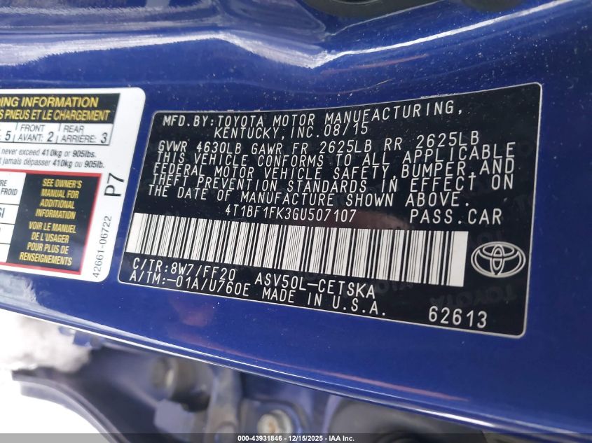 2016 TOYOTA CAMRY - 4T1BF1FK3GU507107, цвет - Синий, 2.5, Бензин, Передний привод из США