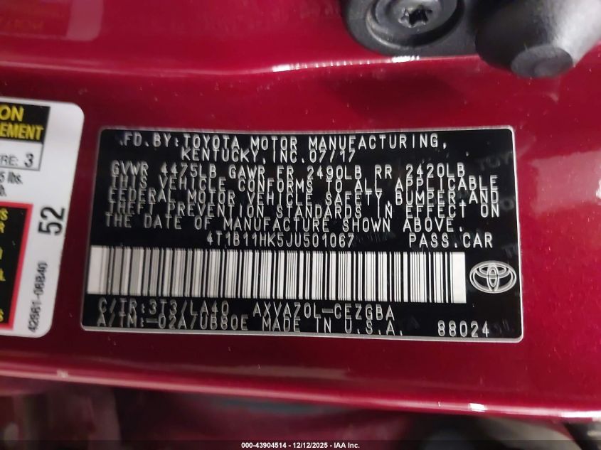 2018 TOYOTA CAMRY - 4T1B11HK5JU501067, цвет - Красный, 2.5, Бензин, Передний привод из США