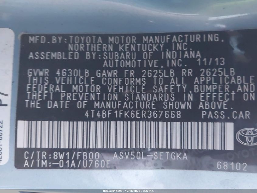 Цвет СинийЦилиндры 4Привод Передний приводVIN 4T4BF1FK6ER367668Состояние НеизвестноПовреждения По всему авто