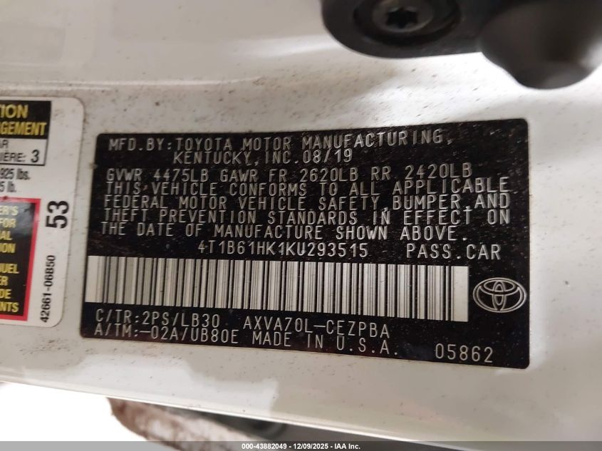 2019 TOYOTA CAMRY - 4T1B61HK1KU293515, цвет - Белый, 2.5, Бензин, Передний привод из США