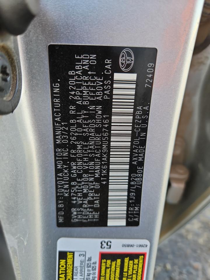 2021 TOYOTA CAMRY - 4T1K61AK9MU567461, цвет - Серебряный, 2.5, Бензин, из США
