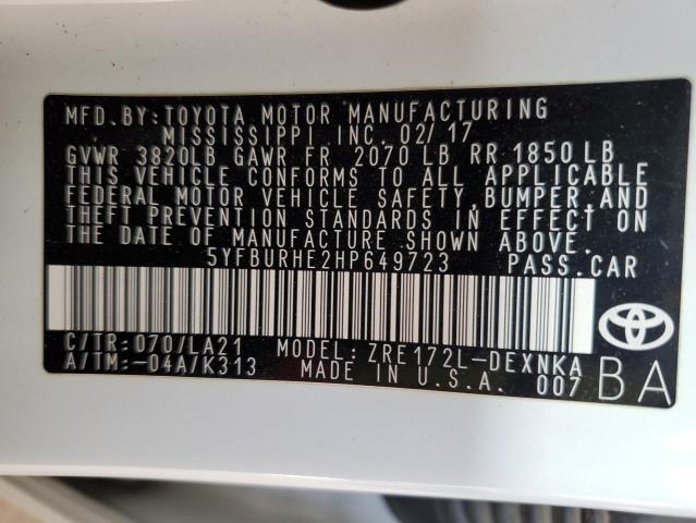 2017 TOYOTA COROLLA - 5YFBURHE2HP649723, цвет - Белый, 1.8, Бензин, из США