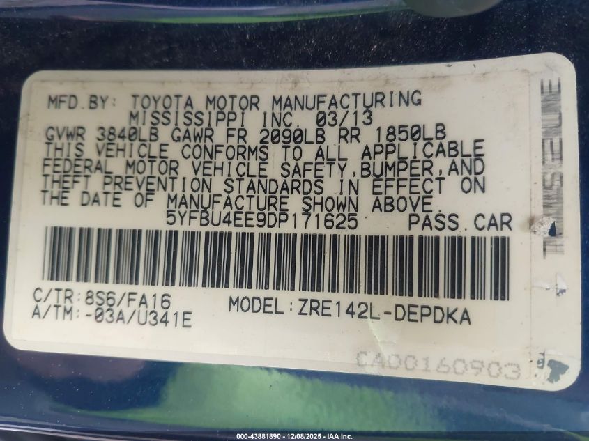2013 TOYOTA COROLLA - 5YFBU4EE9DP171625, цвет - Синий, 1.8, Бензин, Передний привод из США