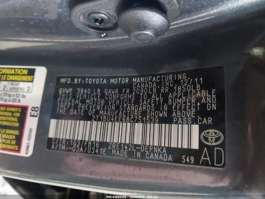 2011 TOYOTA COROLLA - 2T1BU4EE6BC751539, цвет - Серый, 1.8, Бензин, Передний привод из США