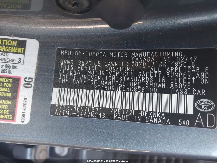 2017 TOYOTA COROLLA - 2T1BURHE0HC858300, цвет - Серый, 1.8, Бензин, Передний привод из США