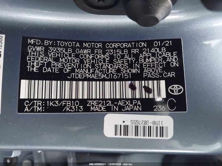 2021 TOYOTA COROLLA - JTDEPMAE5MJ167151, цвет - Синий, 1.8, Бензин, Передний привод из США