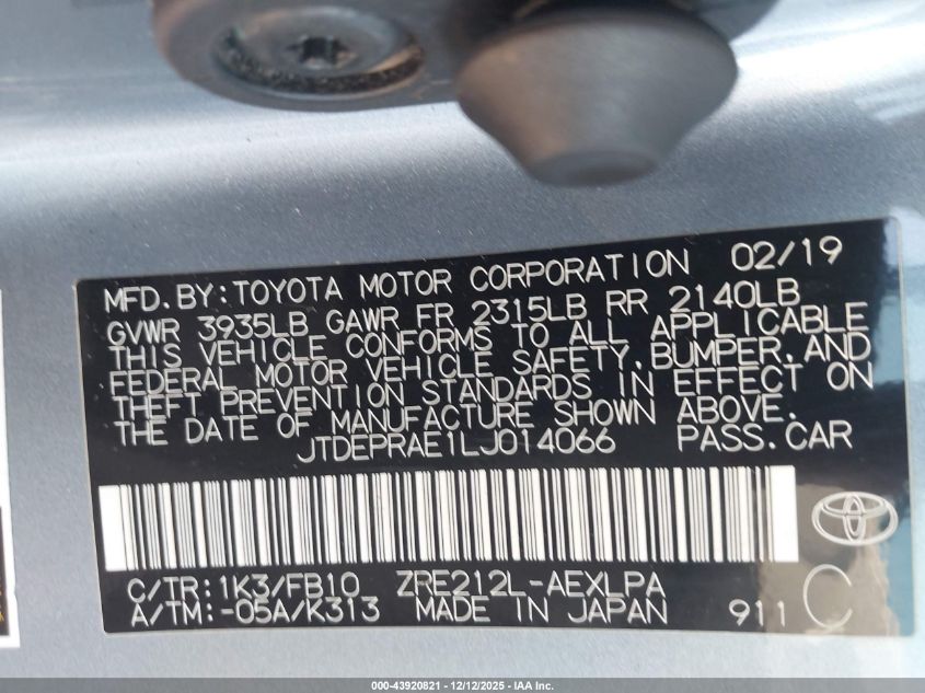 2020 TOYOTA COROLLA - JTDEPRAE1LJ014066, цвет - Синий, 1.8, Бензин, Передний привод из США